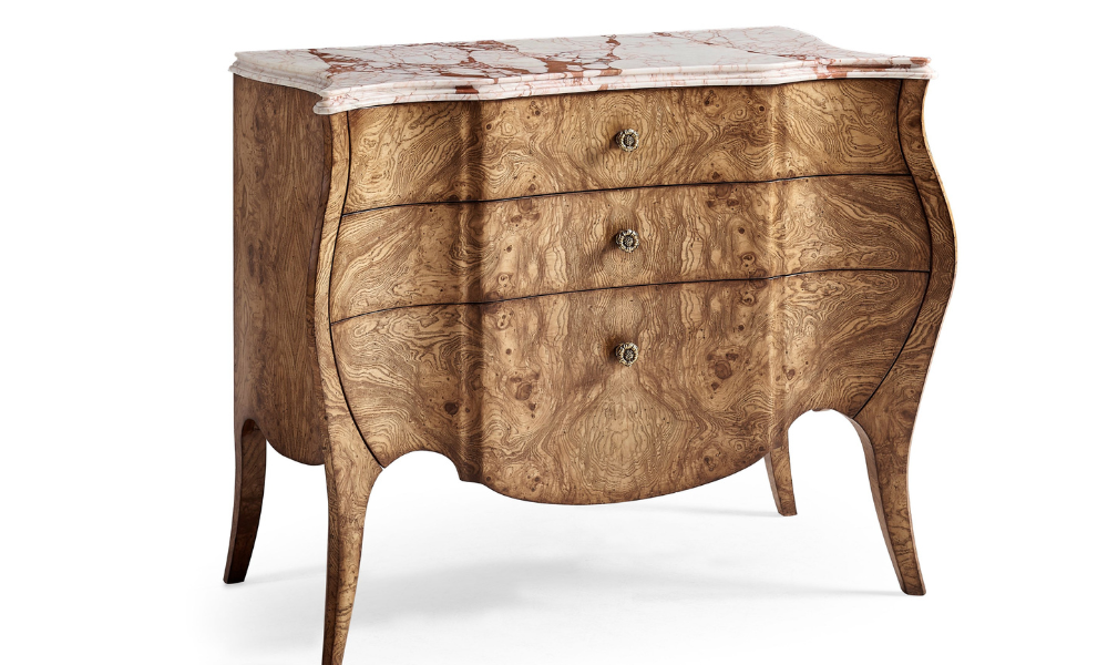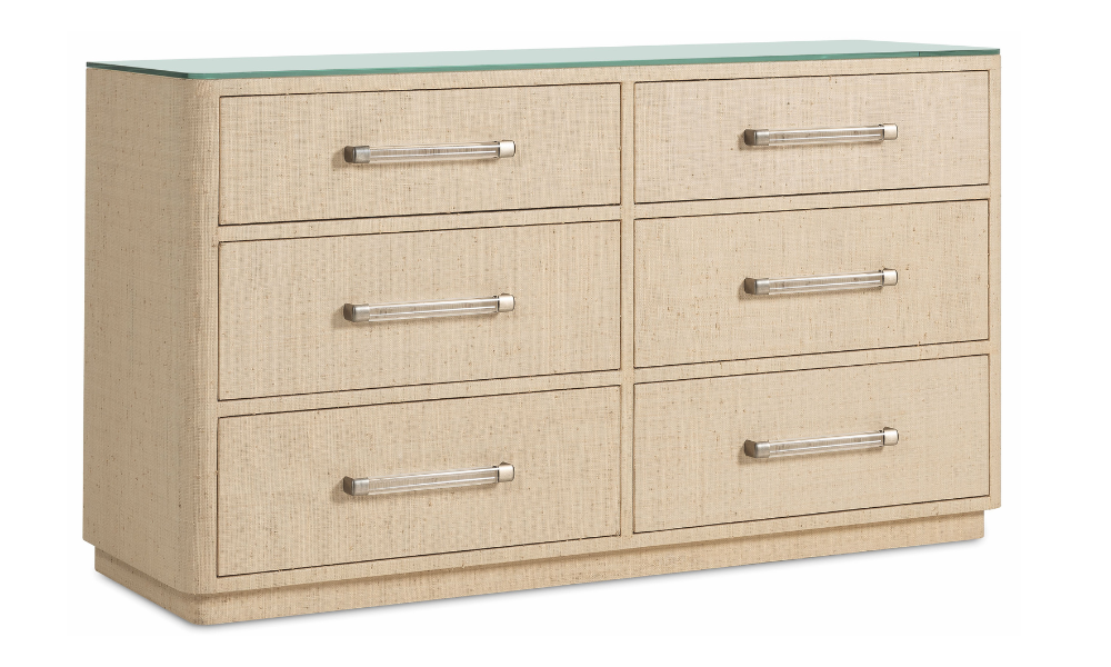 تتميز خزانة الملابس Boca Chia من شركة Hooker Furnishings بستة أدراج وسطح زجاجي وصينية مجوهرات. يتم عرضه في غلاف الرافية والمواد الصلبة من الخشب الصلب بلمسة نهائية طبيعية من الرافية. صالة العرض: صالة العرض، الطابق 3