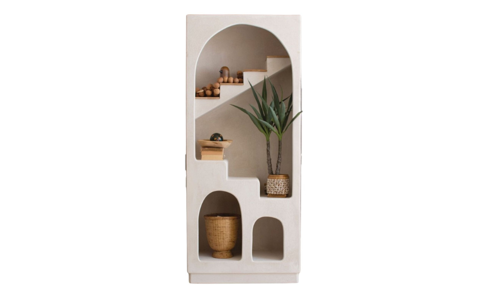 وحدة رفوف معمارية وفنية على حد سواء، وحدة الرفوف المقوسة من Kalalou، مع صورتها الظلية المقوسة، تضيف عمقًا، بينما يخلق التصميم على شكل سلم لحظات طبيعية لعرض النباتات أو الفخار أو الكتب. صالة العرض: أجنحة في ساحة السوق – M-2003، الميزانين