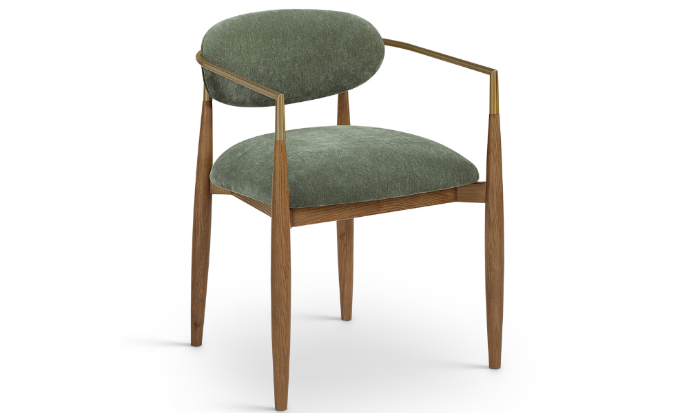 يتميز كرسي الطعام Riccio بذراعين من Meridian Furniture بمفروشات من البوليستر الزيتوني مع إطار خشبي مصنوع من خشب الجوز ولمسات نحاسية مصقولة. تم تصميمه لتحقيق التوازن بين الراحة والأناقة، فهو يقدم مزيجًا من الأنسجة المناسبة لبيئات تناول الطعام المعاصرة والانتقالية. صالة العرض: IHFC، C403