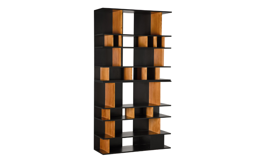 خزانة الكتب Mortan من Noir Trading عبارة عن وحدة رفوف منحوتة تتميز بمستويات أفقية سوداء مفروكة يدويًا وفواصل عمودية دافئة من خشب الساج، مما يخلق عدم تناسق إيقاعي وعمق بصري كبير ومناطق عرض مرنة ومجزأة. صالة العرض: IH002